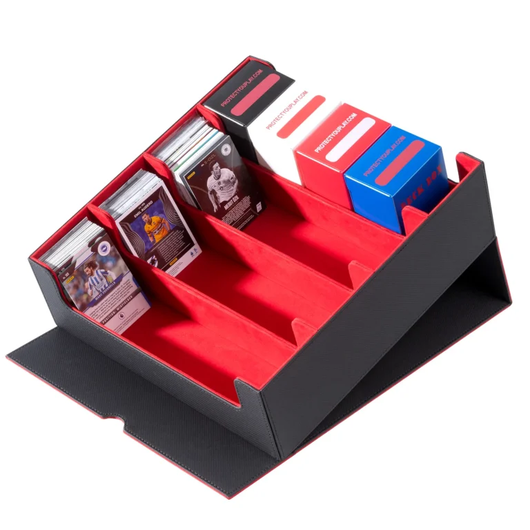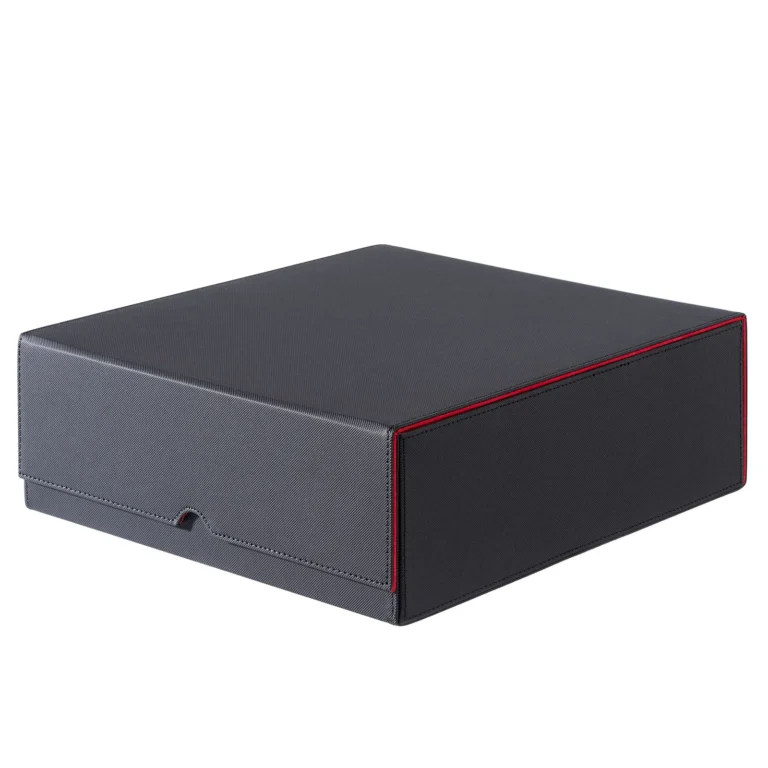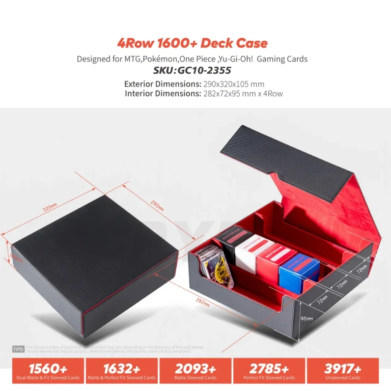 The card storage box can hold 3200+ double-sleeve cards. lts U-shaped wide mouth opening and flip-cover design allow for easy retrieval of your cards, ensuring smooth and hassle-free gameplay.