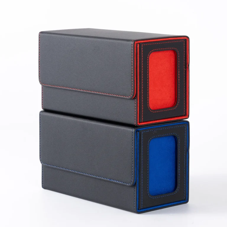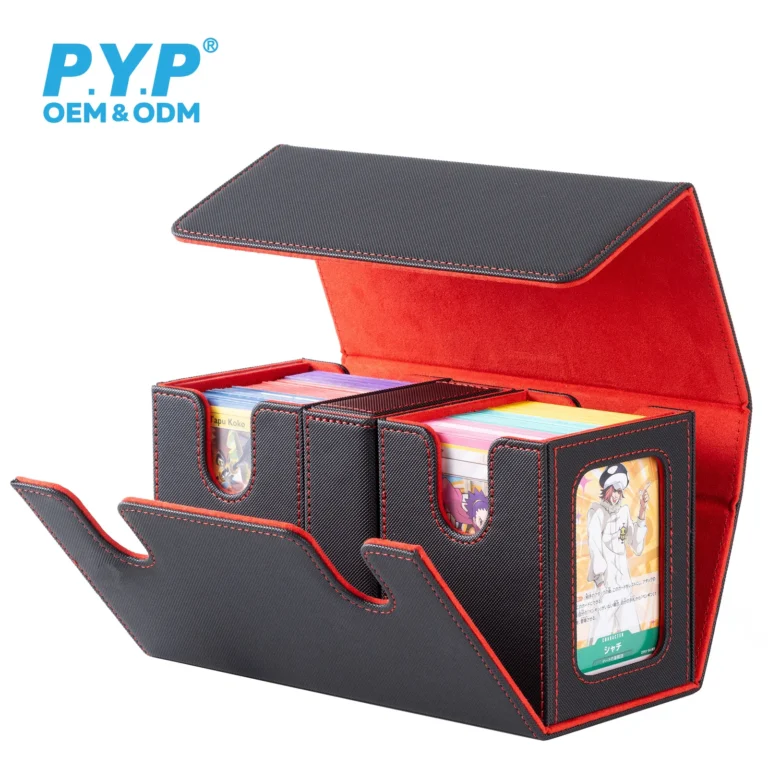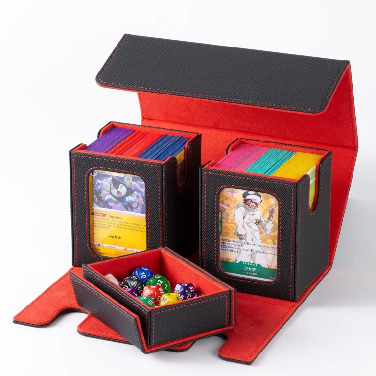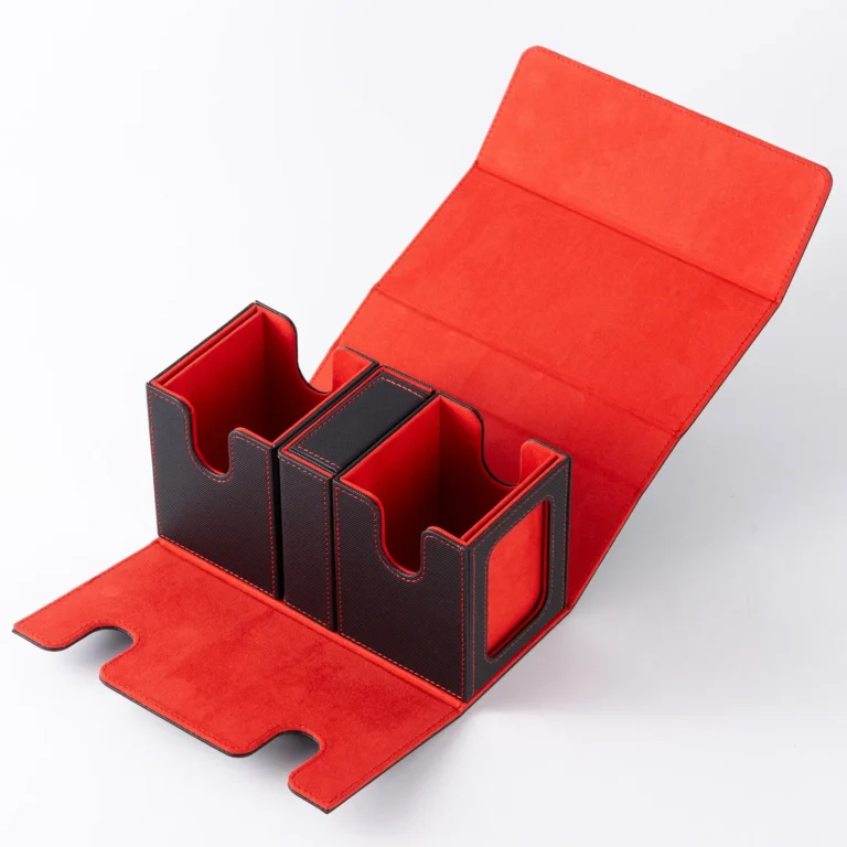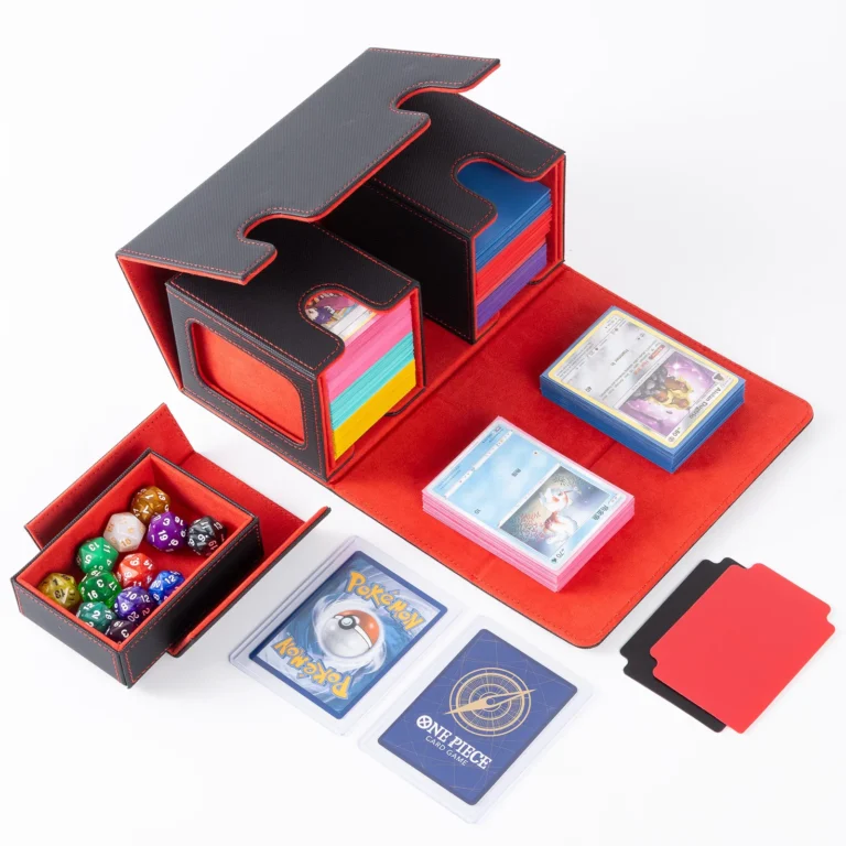 • The card storage box can hold 200+ double-sleeve cards. lts U-shaped wide mouth opening and flip-cover design allow for easy retrieval of your cards, ensuring smooth and hassle-free gameplay.