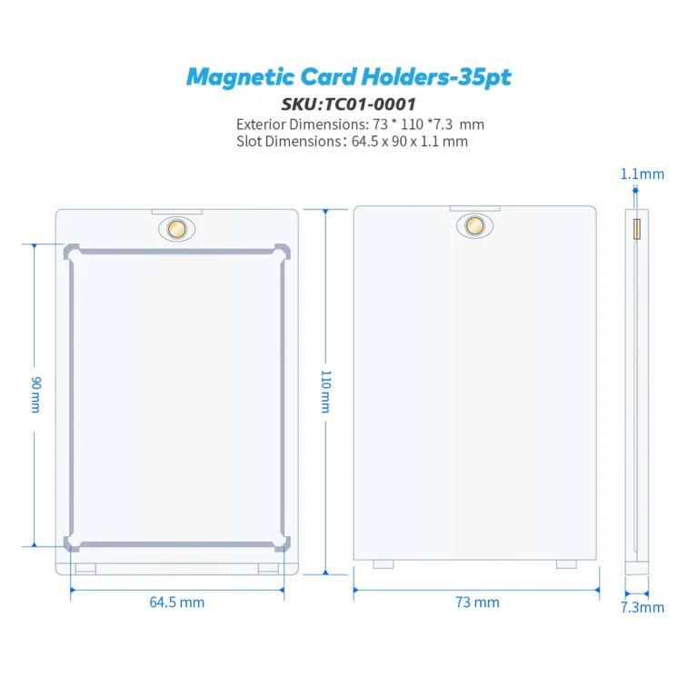 Sized to fit standard size (2.5″ x 3.5″) sports trading cards or gaming cards in multiple thicknesses.