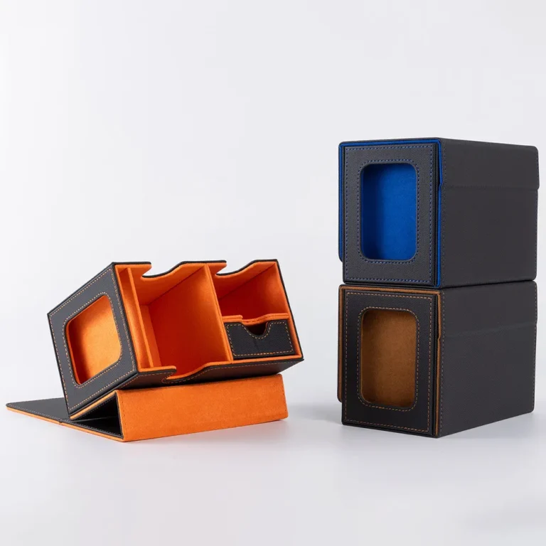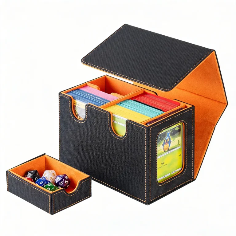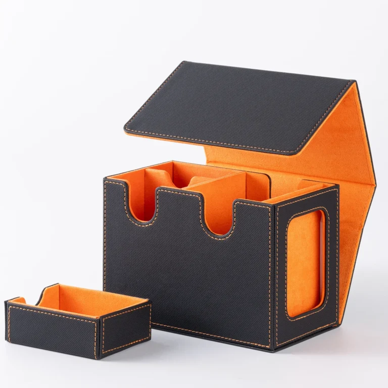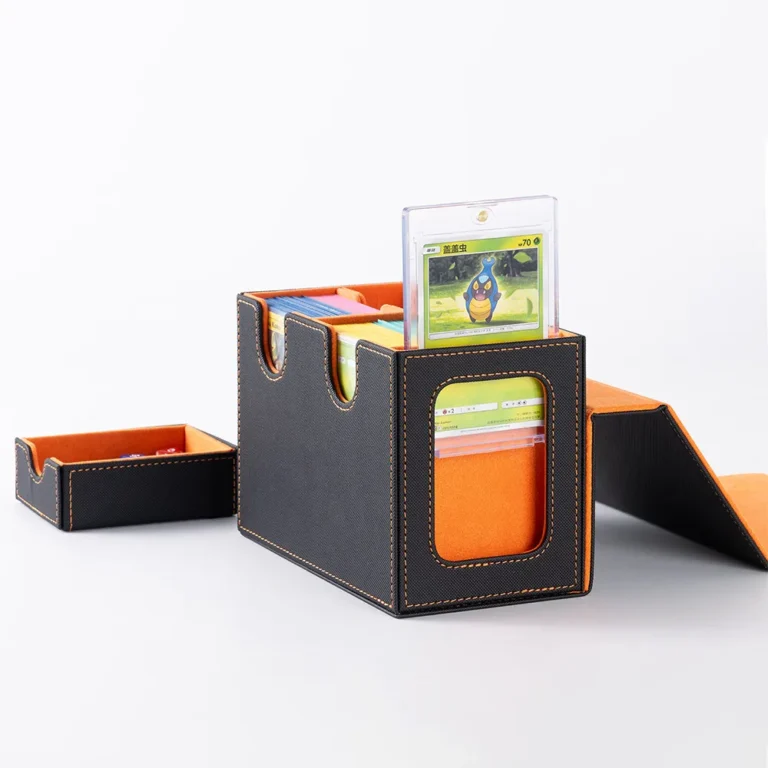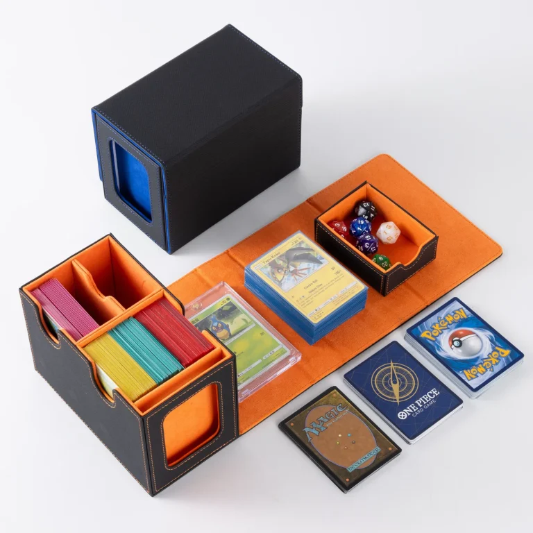 • The card storage box can hold 280+ double-sleeve cards. lts U-shaped wide mouth opening and flip-cover design allow for easy retrieval of your cards, ensuring smooth and hassle-free gameplay.
